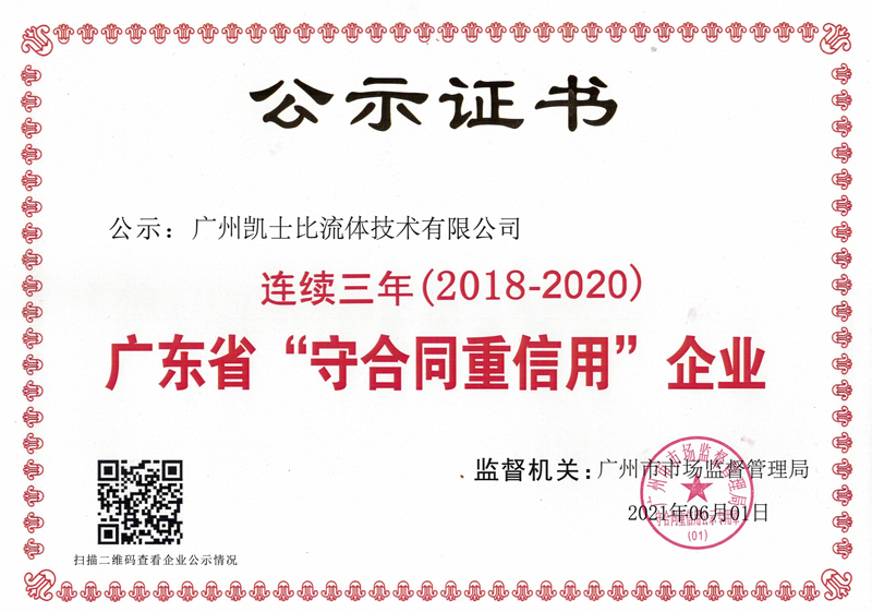 廣州凱士比流體技術(shù)有限公司連續(xù)三年(2018-2020)獲得廣東省“守合同重信用”企業(yè)公示證書。